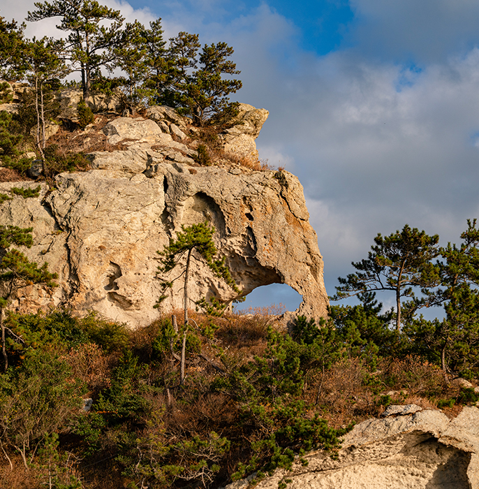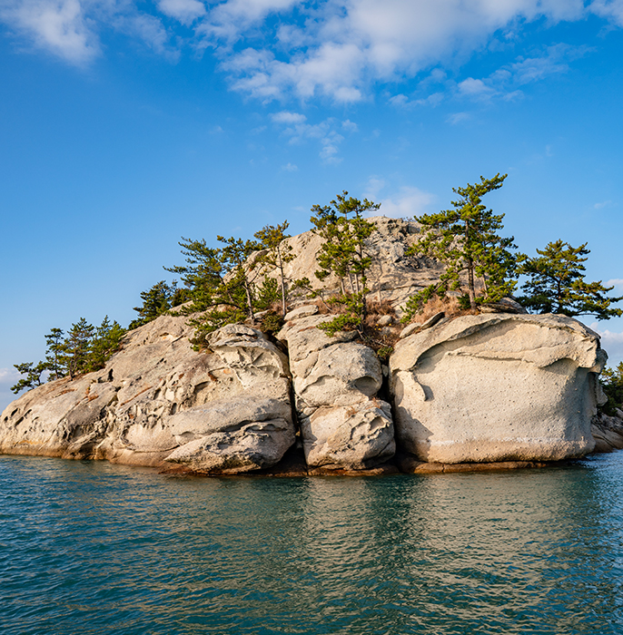 초가집 지붕처럼 부드럽게 얹힌 암석 형태가 독특하며 금당도의 소박한 자연미를 상징…